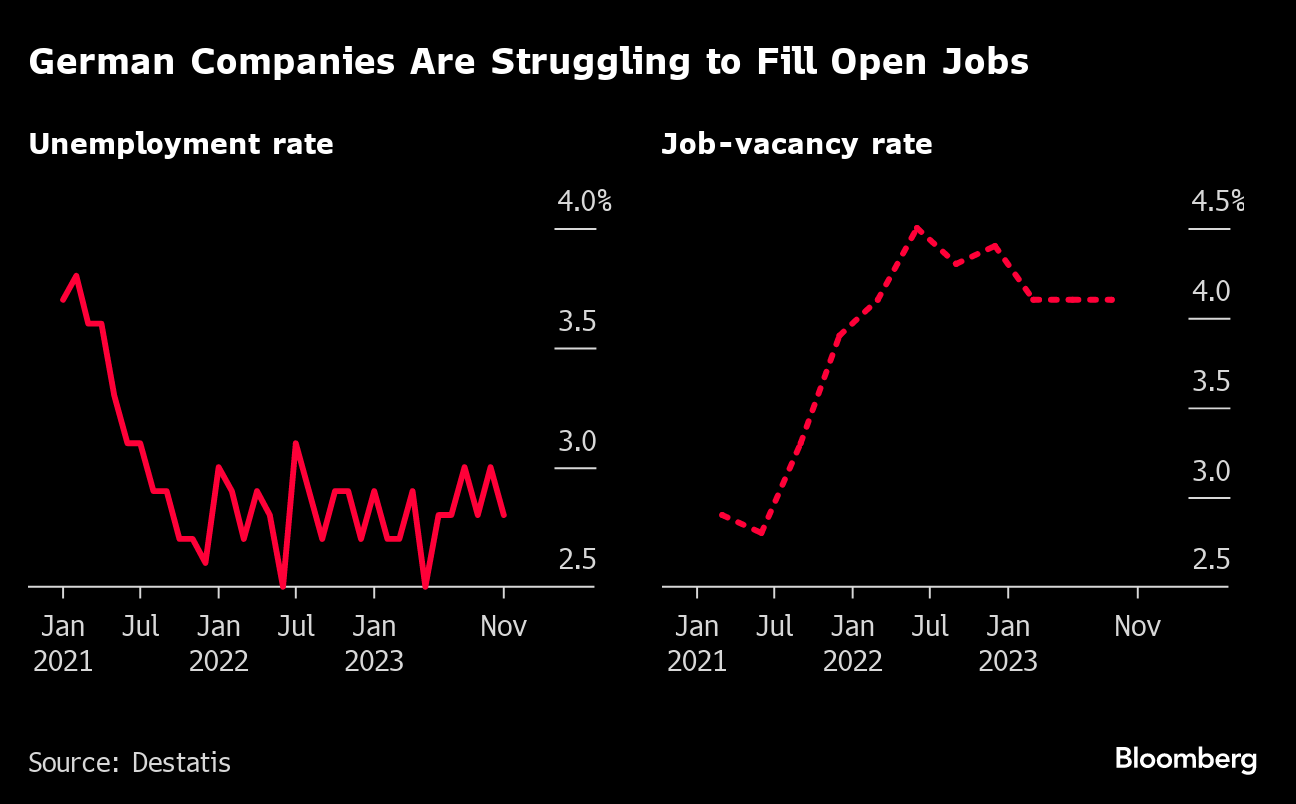 According to an industry lobby survey last year, half of German companies are at least partly unable to plug vacancies. Software giant SAP SE stopped asking for university degrees from applicants in 2022, while real estate firm Vonovia SE recruited people from Colombia last year to cope with the shortage.