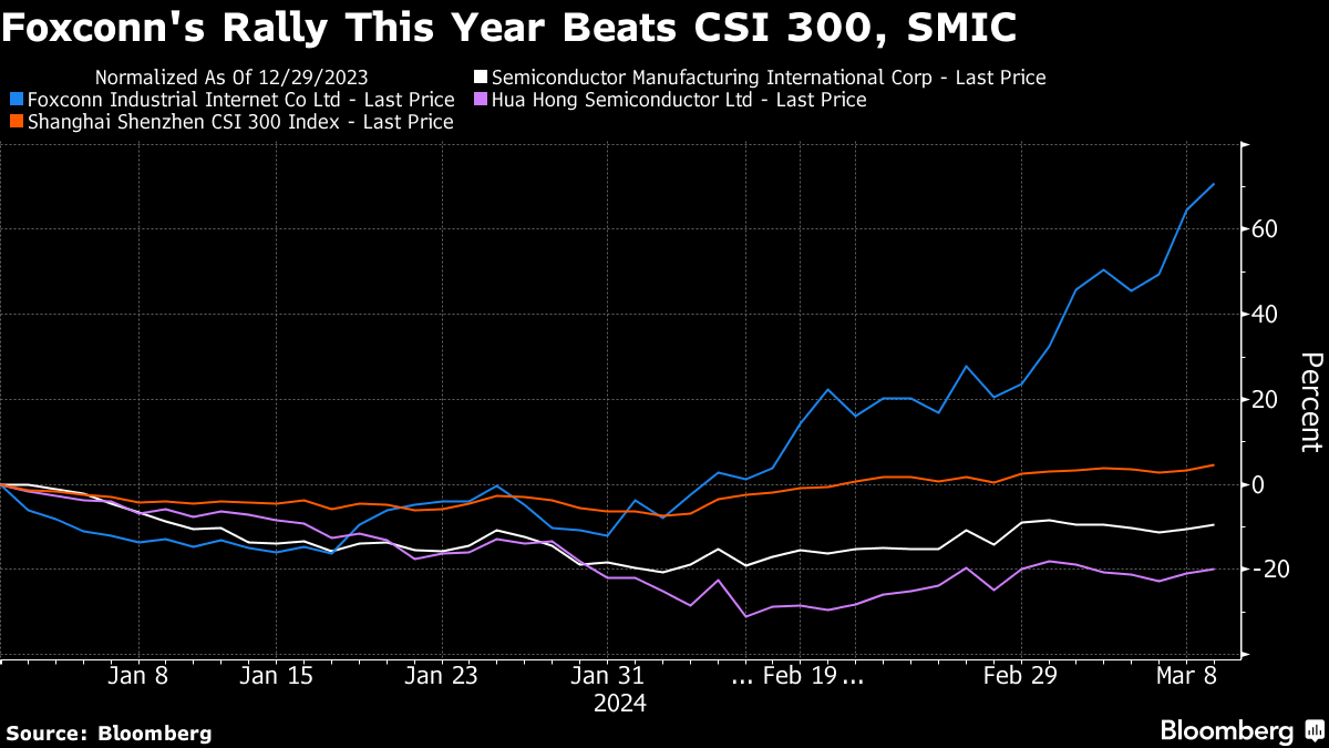 The AI server maker, controlled by Taiwanese billionaire Terry Gou's Hon Hai Precision Industry Co., has seen its stock more than double in Shanghai since mid-January. Its performance this year beats all others on the benchmark CSI 300 Index and compares with a drop of more than 9% in the mainland chip-making leader Semiconductor Manufacturing International Corp.
