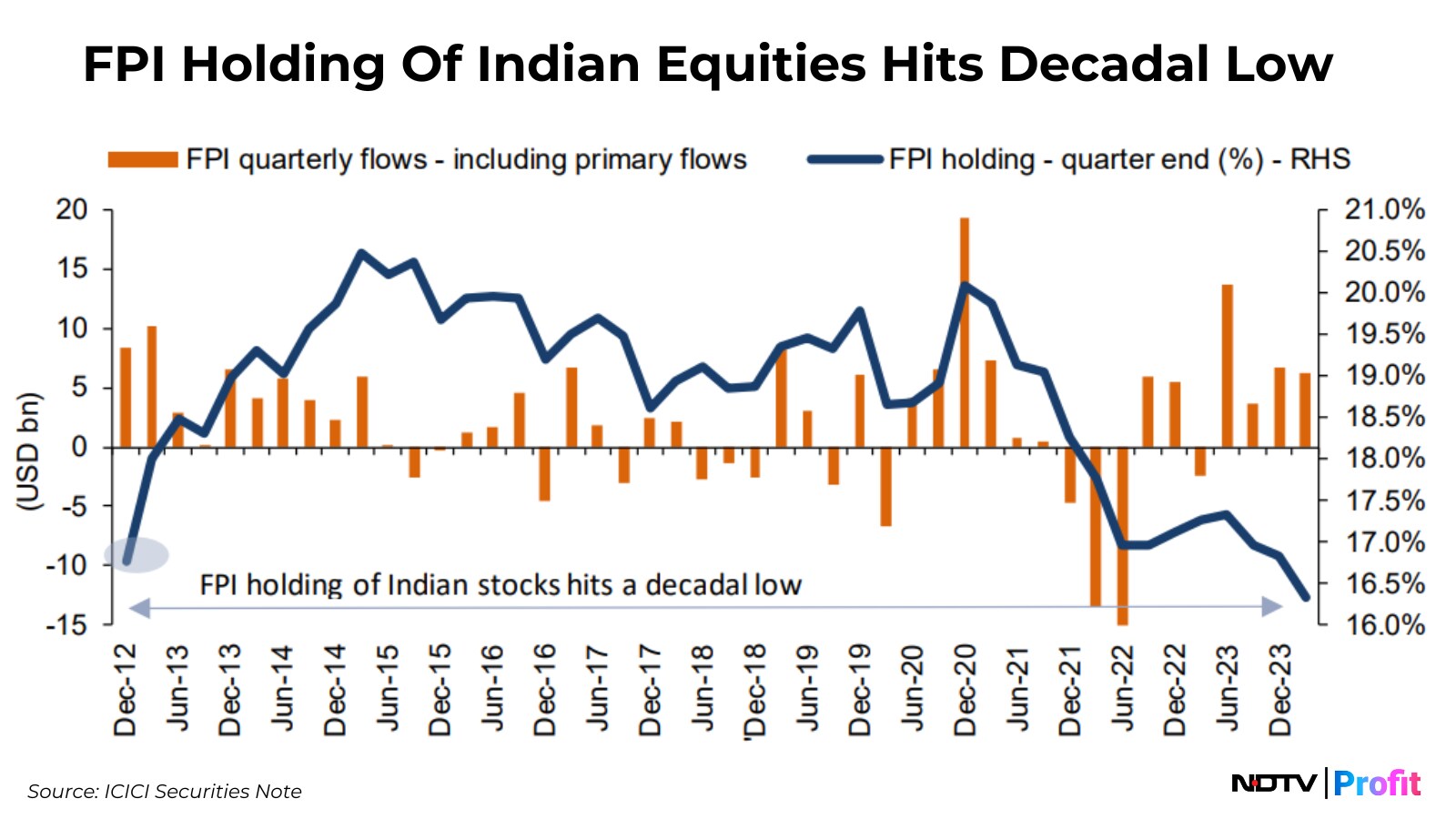 Foreign portfolio investors' aggregate holding in Indian stocks fell to a decadal low by the end of January 2024, according to ICICI Securities.