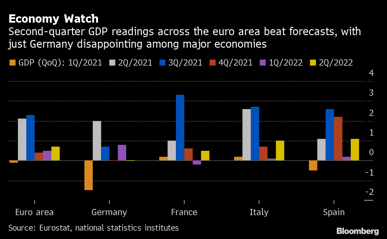 Spain and Italy both reported second-quarter growth of 1% or more from the previous three months, buoyed by an influx of post-lockdown tourists. French gross domestic product rose after a surprise contraction at the start of 2022.