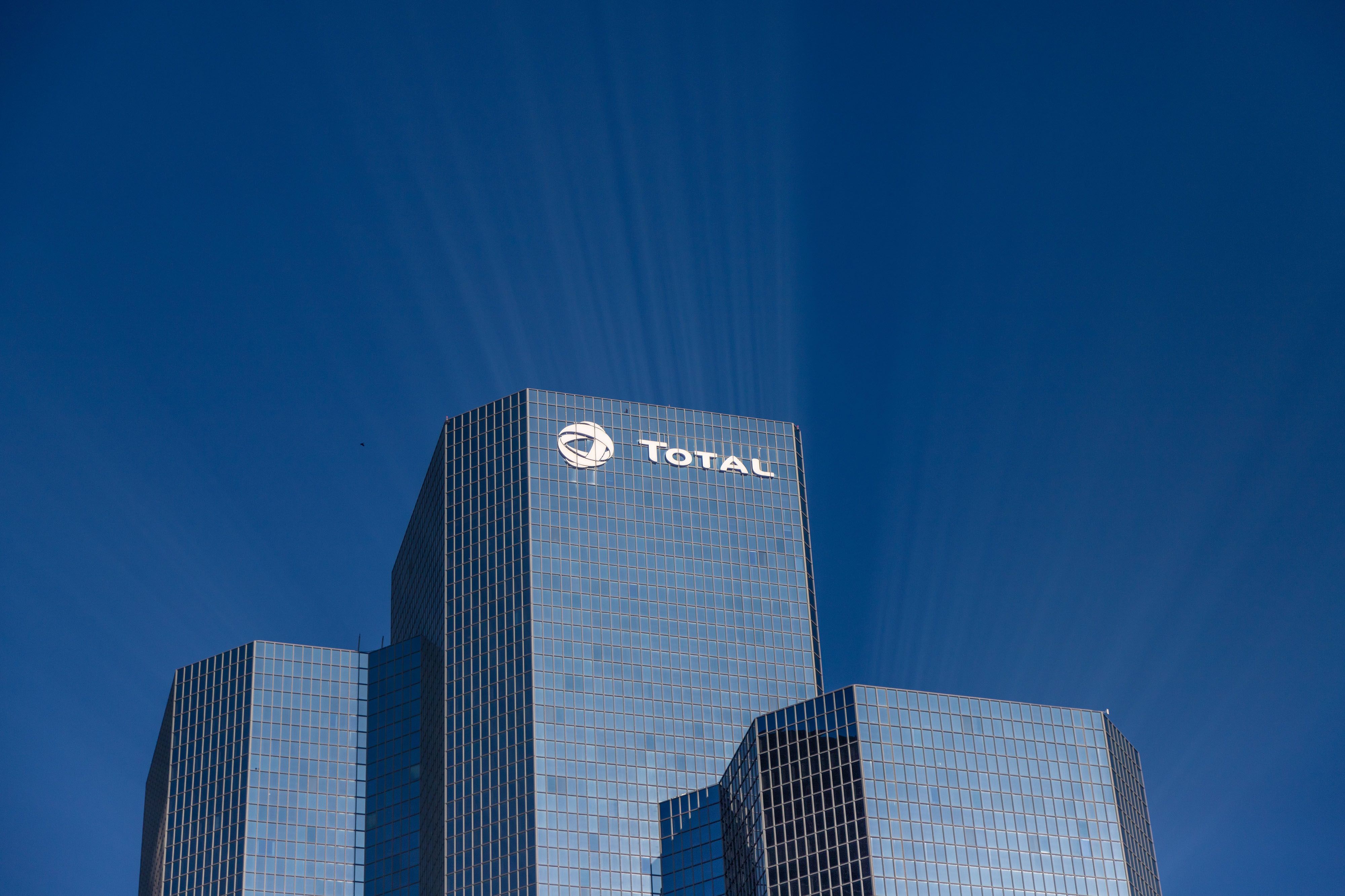 A logo sits on the exterior of the Total SA skyscraper headquarters in Paris, France. (Photographer: Anita Pouchard Serra/Bloomberg)