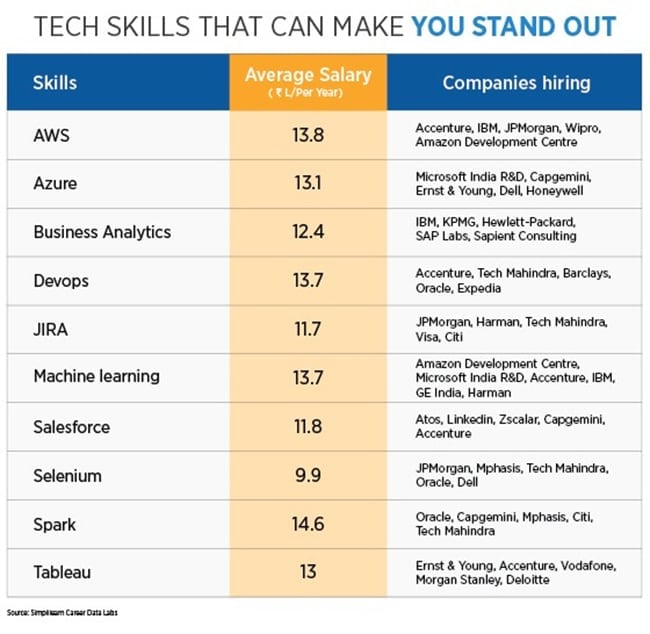 Spark: Oracle, Capgemeni, Mphasis, Citi and Tech Mahindra are looking for people with proficiency in Spark - software which enables firms to sift through large amounts of data stored on the cloud. Engineers trained in this technology earn an average salary of 14.6 lakh per annum.