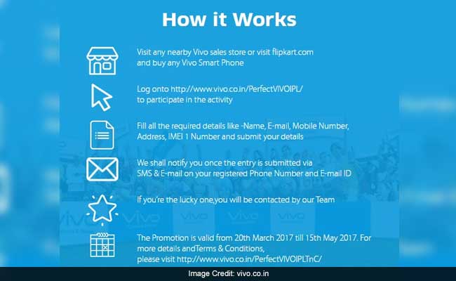 Vivo is offering some of its customers free premium tickets to Indian Premier League or IPL 2017 finals. Customers buying Vivo smartphones between March 20, 2017 and May 15 are being offered a chance to win "free VIP ticket to VIVO IPL finals", Vivo said on its website - vivo.co.in. The offer, Vivo added, is valid till May 15, 2017. The promotional scheme by Vivo also offers a free round trip and free 5-star hotel stay. "Lucky winners to be announced every week," Vivo said. Vivo customers with Jio connections are also being offered up to 168 GB of 4G data in another scheme called "Vivo-Jio Cricket Mania". Vivo is this year's title sponsor of the Indian Premier League.