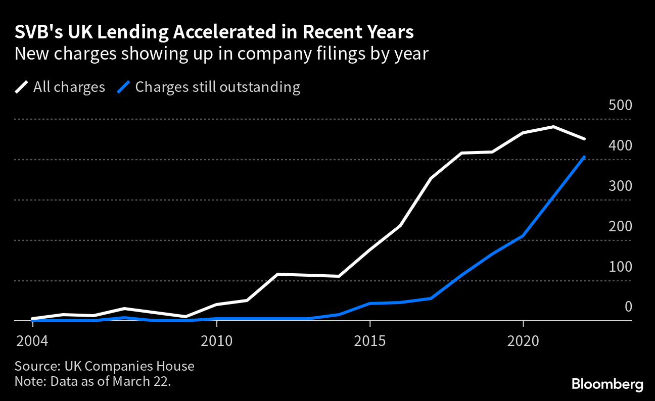 SVB UK has enjoyed rapid growth in recent years, according to the number of charges filed with the UK's Companies House corporate register in recent years. After entering the UK market in 2004, it took several years for the business to gain traction. The analysis shows the number of charges registered by SVB in the UK broke through 200 around 2016, but in recent years business had more than doubled to more than 400 charges a year.