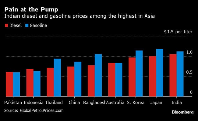Taxes on the two fuels now account for almost two-third's of what Indians pay at the pump, making Indian retail prices among the highest in Asia and almost double that in neighboring Pakistan. The recovery in global crude prices, meanwhile, has boosted Indian fuel costs even further in the last few months.