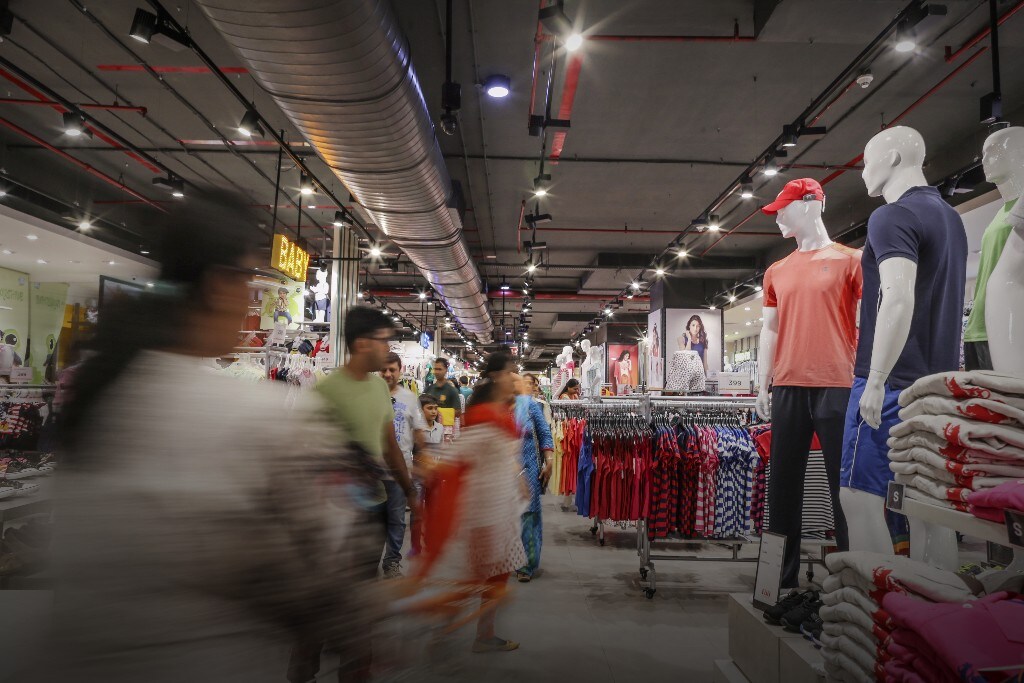 Customers walk past clothes on display at hypermarket, operated by Future Retail (Photographer: Dhiraj Singh/Bloomberg)
