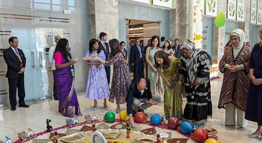 They were received by Kyoko Jaishankar, the wife of India's External Affairs Minister S Jaishankar. They were welcomed by two grand 'millets-rangolis' capturing the theme of 'Harmony of Harvest' and 'The World is One Family' at the exhibition organised by Ministry of Agriculture.