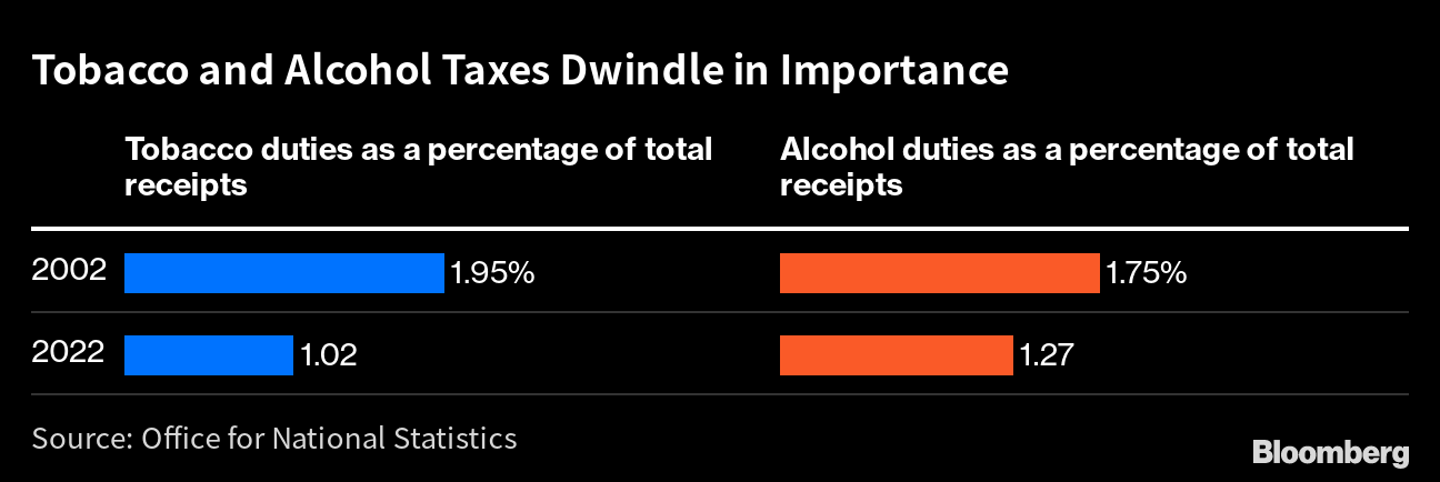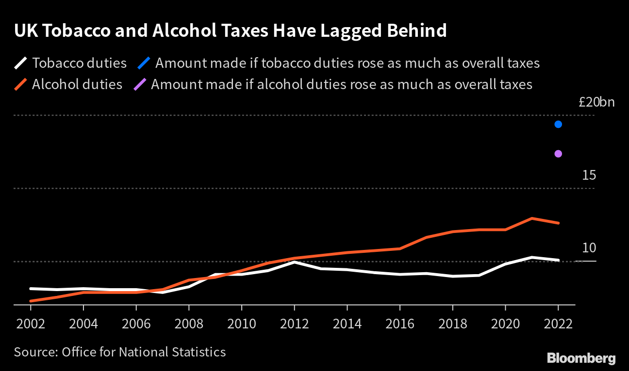 The government would have taken in an additional £9.3 billion in revenue from tobacco duties and £4.7 billion for alcohol if the level of income from those levies had remained stable since 2002, according to a Bloomberg analysis of official estimates.