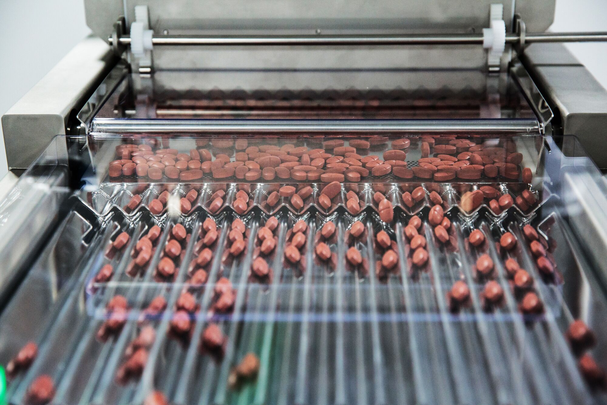 Pills move through a sorting machine at a pharmaceutical plant in Visakhapatnam, India.