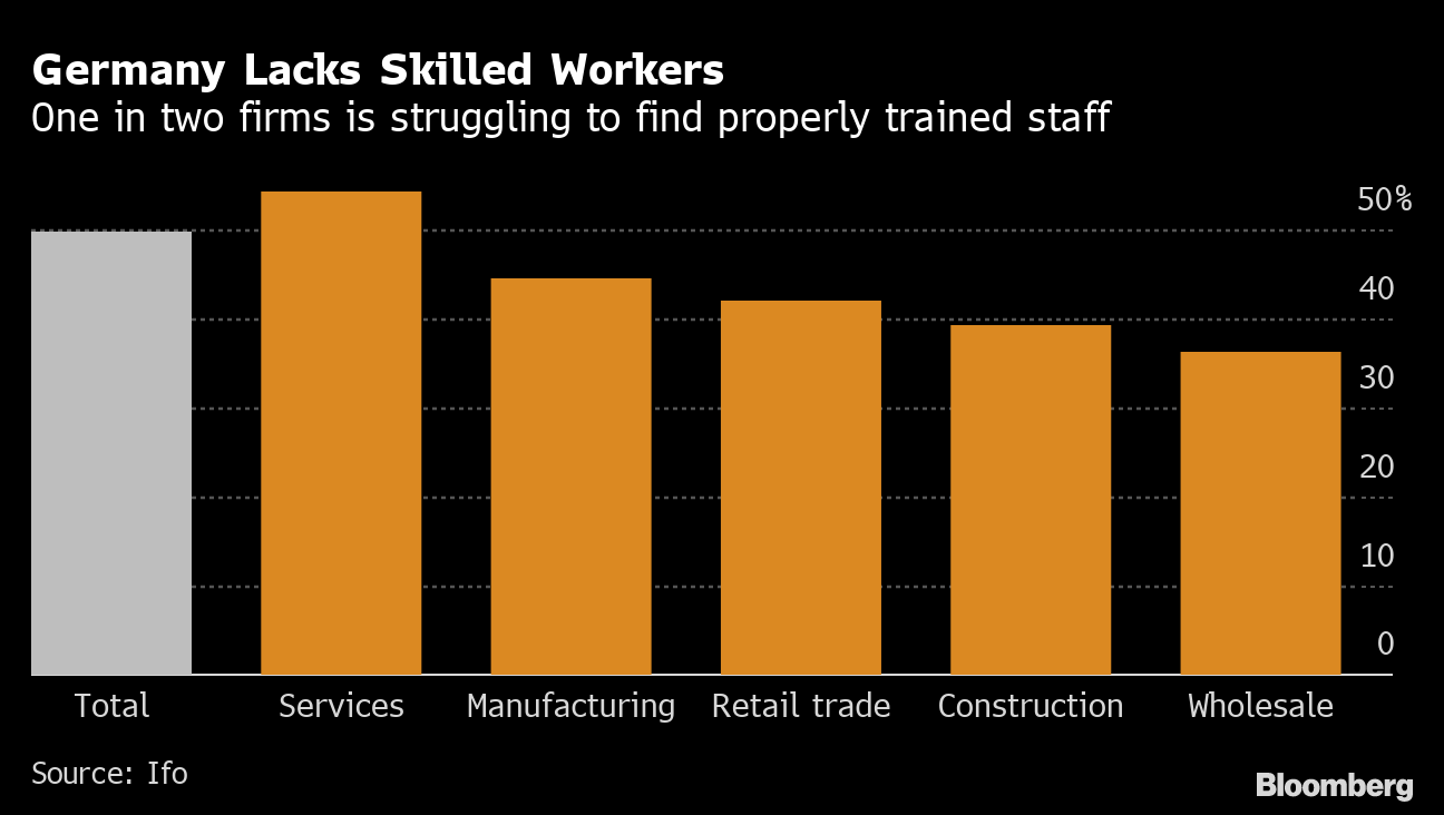 The figures underscore the severe shortage of skilled labor facing German companies amid a rapidly aging population and pandemic-induced behavioral shifts. Labor isn't the only input they are having trouble finding, with supply bottlenecks and soaring energy costs also weighing on output.