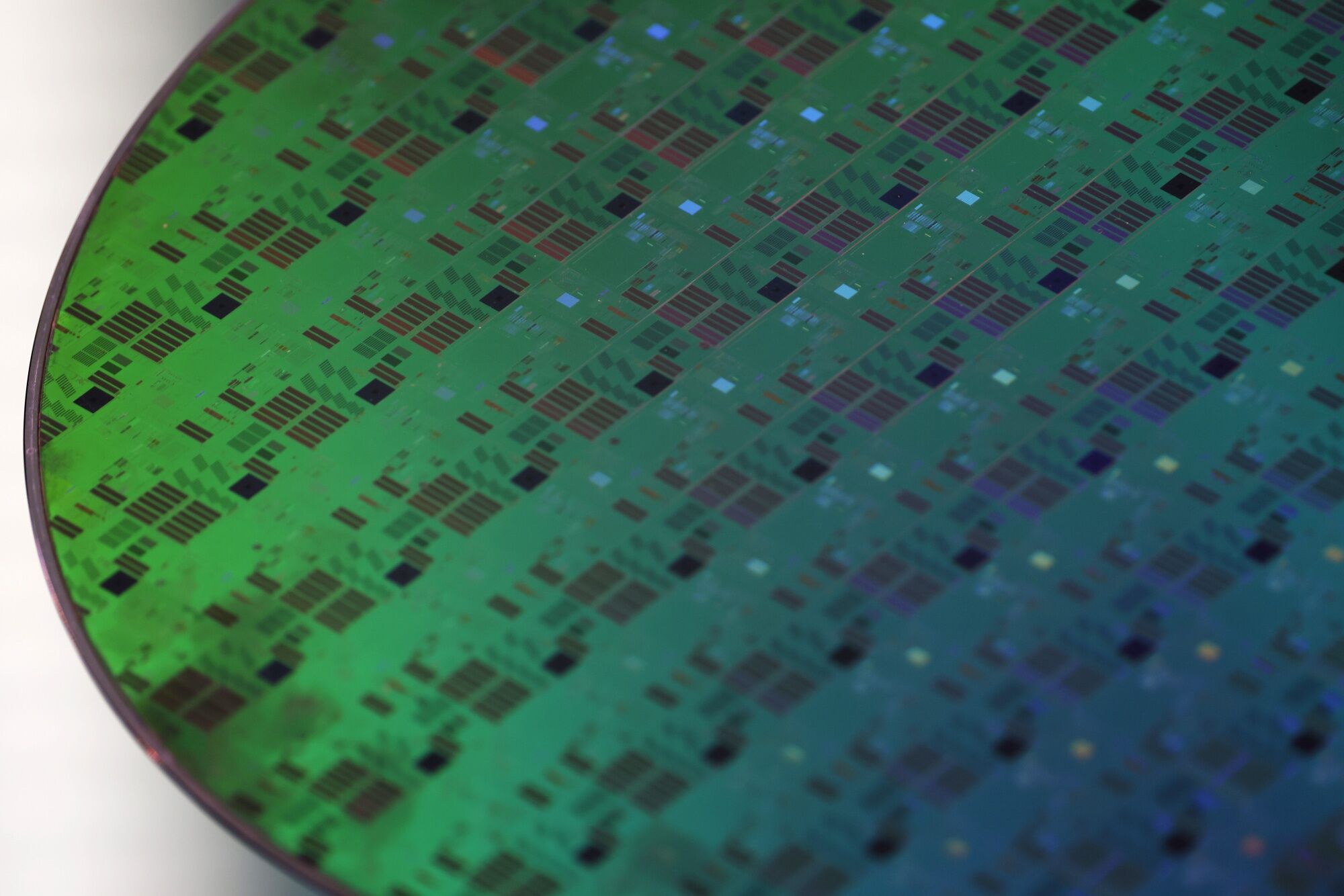 A 300 millimetre silicon wafer at the Globalfoundries Inc. semiconductor plant in Dresden, Germany, on Thursday, Aug. 12, 2021. Globalfoundries hosted German election front-runner Armin Laschet today as he comes under pressure to regain the initiative after a rocky several weeks hit the conservative bloc’s support. Photographer: Liesa Johannssen-Koppitz/Bloomberg