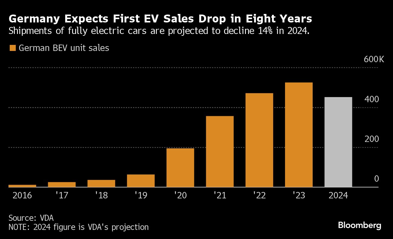 In Germany, sales are set to drop 14% this year in response to the government yanking subsidies in December, the first decline since 2016, according to the VDA lobbying group. Globally, market watchers have trimmed forecasts amid the enduring reality that the vehicles are much less affordable than equivalent combustion-engine cars — despite a price war kicked off by Tesla.