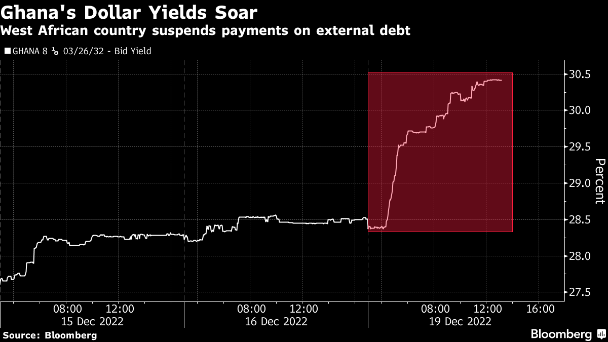 (Bloomberg) -- Ghana suspended interest payments on its external debt, catching bondholders by surprise ahead of restructuring talks aimed at unlocking an International Monetary Fund bailout.