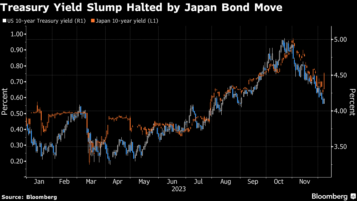The yield on 10-year US notes jumped seven basis points to 4.18%, paring declines this week to a mere two basis points. That came as similar-dated Japanese yields soared by the most this year, after comments from central bank Governor Kazuo Ueda on more challenging policy ahead and a weak auction of long-term debt.