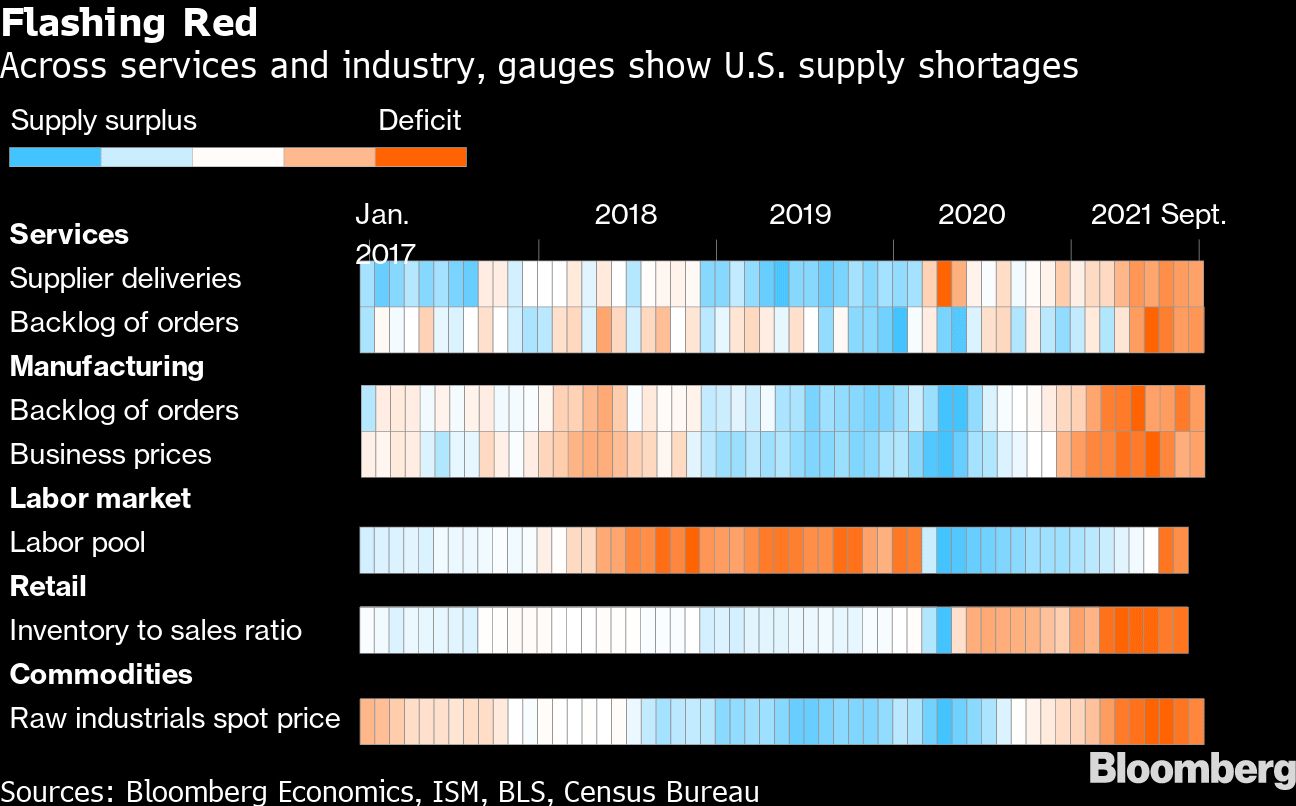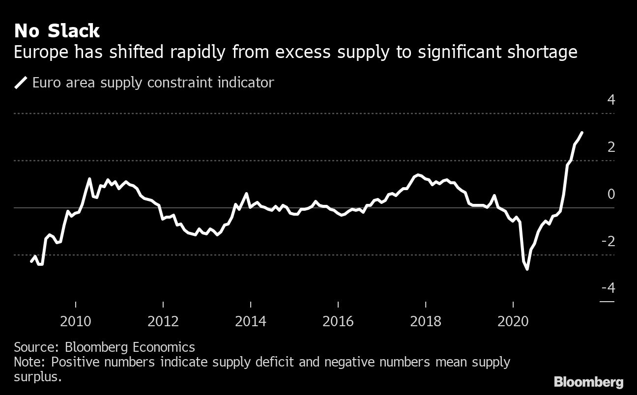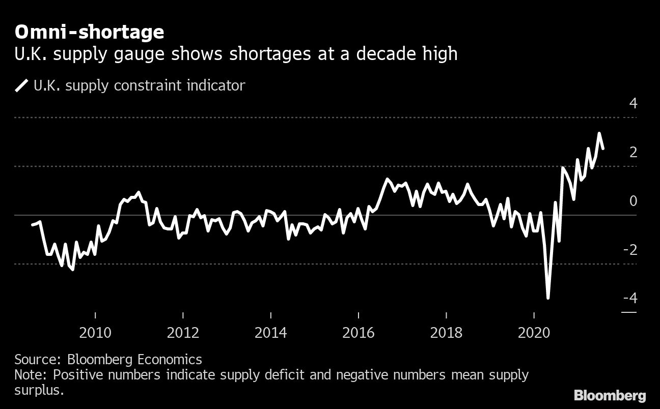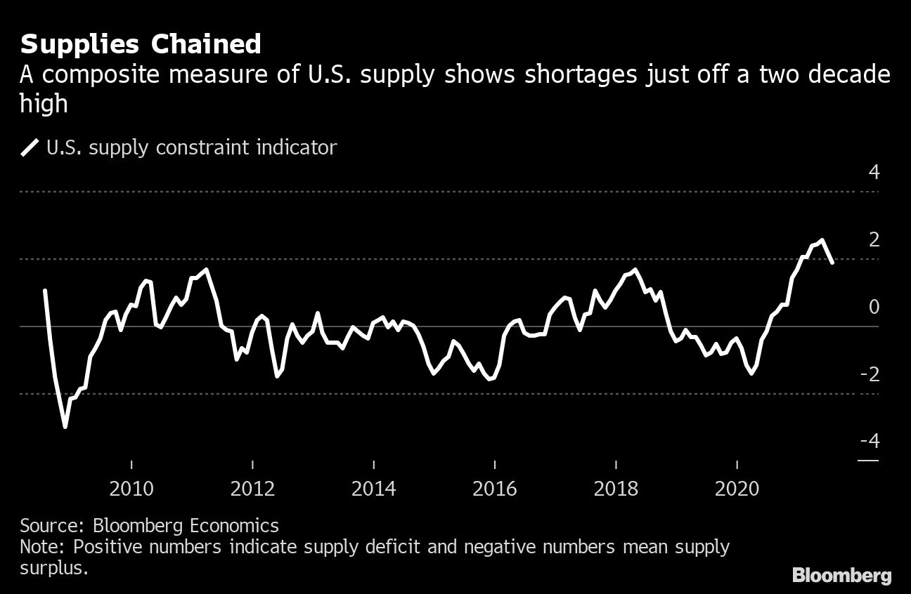 Pulling all these pieces together, the Bloomberg Economics supply indexes show shortages just off a 20-year high in the U.S. Gauges for the U.K. and euro area are at a similarly elevated level.