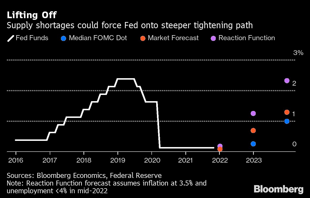 Traders are currently pricing in two Fed rate hikes in 2022, two more than the median member of the Federal Open Market Committee. A Bloomberg Economics model of the Fed's reaction function — its policy response to changes in the economy — suggests that if inflation runs strong and unemployment falls, even two hikes next year might not be enough.