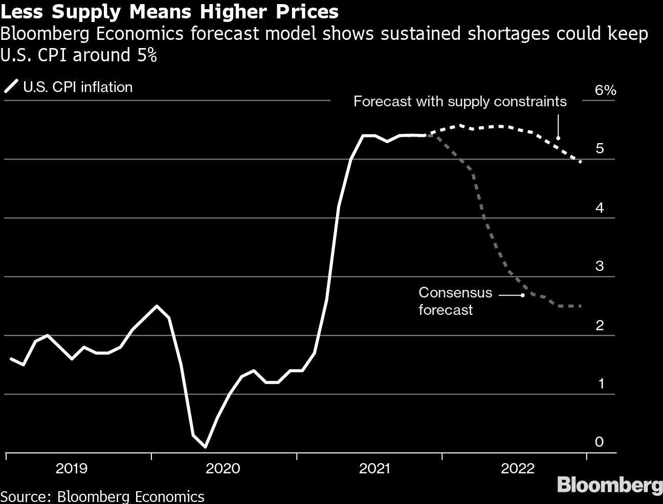 Inflation is already running high enough to be outside the comfort zone for monetary policy makers. In the U.S., it's at 5.4% now and could stay lodged in the 4% to 5% range next year if supply constraints don't ease, according to Bloomberg Economics models.