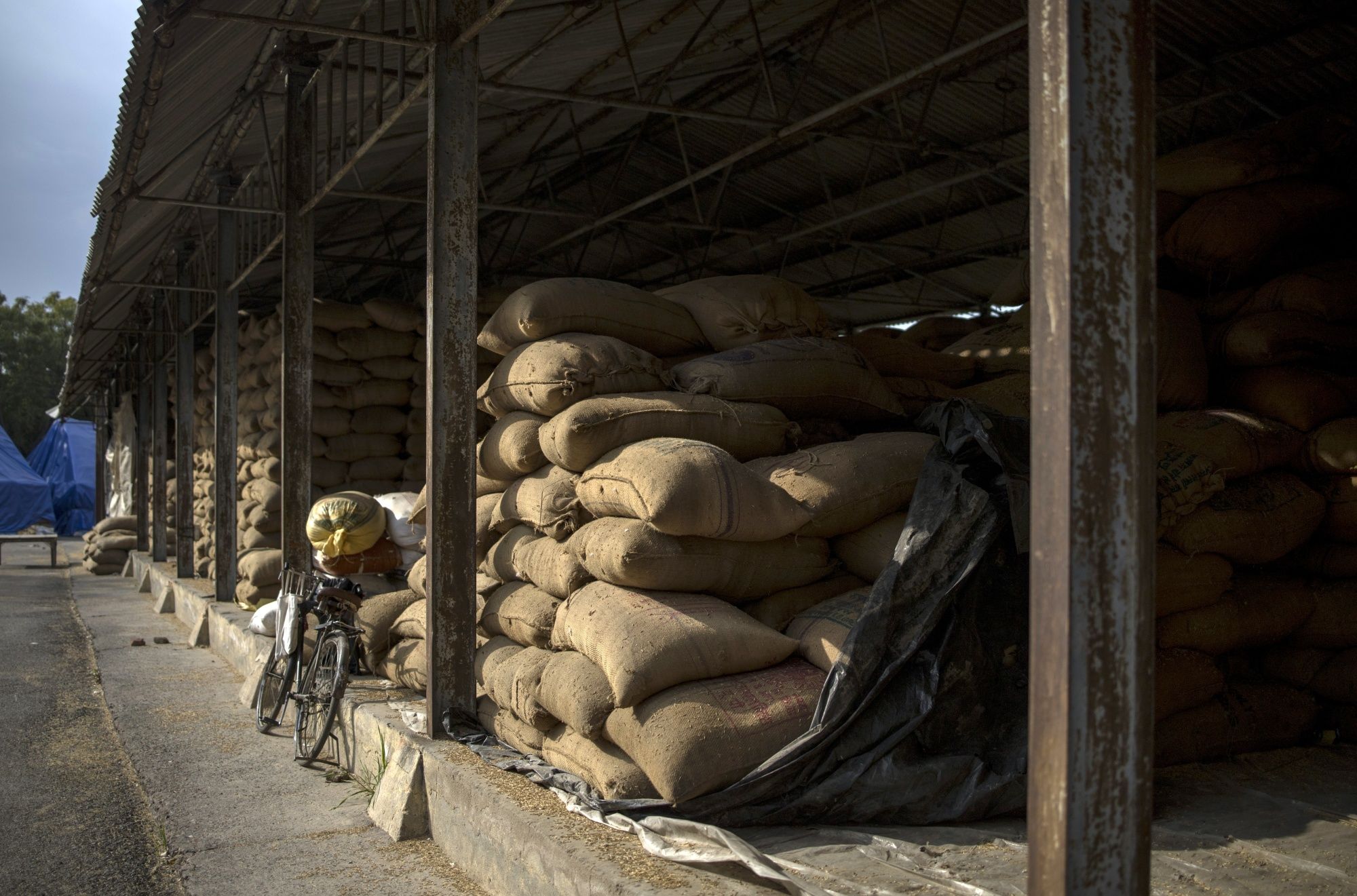 Sacks of paddy rice stacked at a wholesale grain market in Dankaur, Uttar Pradesh, India, on Saturday, Feb. 26, 2022. Rice is the latest commodity to get swept up in the turmoil of Russia’s invasion of Ukraine.