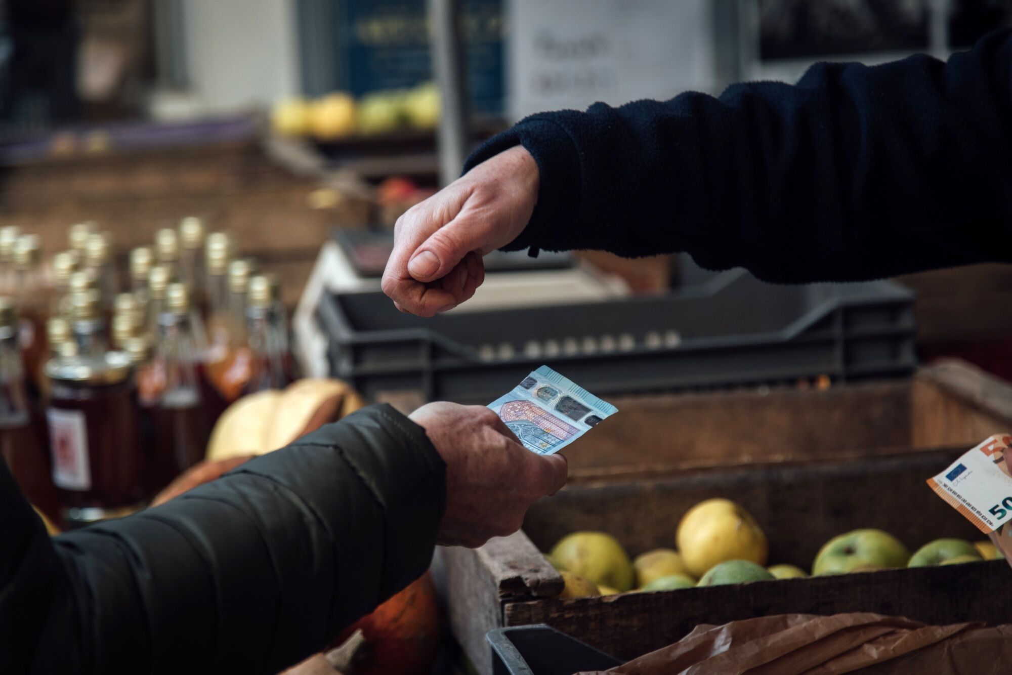 A customer pays with cash at a fruit stall in the Red Children Market in Paris, France. (Photographer: Cyril Marcilhacy/Bloomberg)
