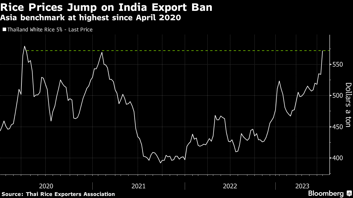 Rice prices in Asia surged to the highest in more than three years last month after India — the world's biggest exporter — banned some of its shipments. The grain is essential to the diets of billions of people and further price gains would burden consumers with additional inflationary pressure.