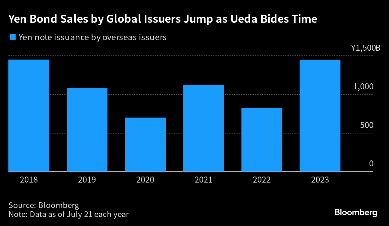 Investors have scooped up yen debt from issuers outside Japan, fueling the busiest July since 2018. Deals have included Canada's Toronto-Dominion Bank, Korea Investment & Securities Co. and France's BPCE SA, which priced the biggest institutional offering since 2019 in the Samurai market.