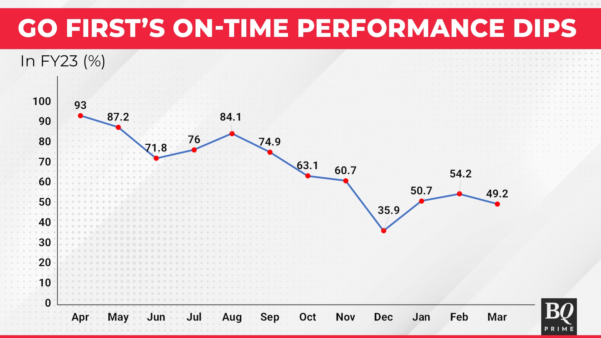 The biggest drop in performance was in time management, with only half of Go First's flights being on time in March 2023.