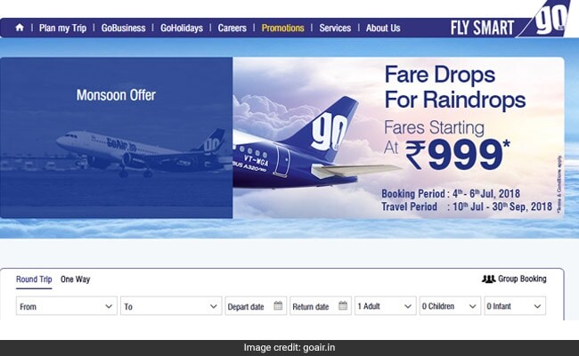 Budget carrier GoAir is offering domestic flight tickets starting from Rs 999 under the 'Monsoon Sale', said the airline on microblogging website - Twitter. GoAir's offer comes at a time when other airlines in the country -- AirAsia, Jet Airways and Vistara -- are also offering flight tickets at discounted rates. Customers can book flight tickets under the offer till July 6, 2018, which is valid on a host of destinations. The travel period under GoAir's offer starts from July 10 and is valid till September 30.