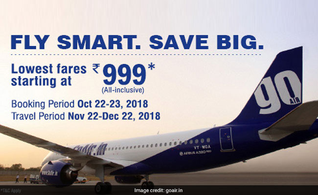 GoAir said that it is offering domestic flight tickets at a starting all-inclusive price of Rs 999. The booking period of the offer will end on October 23, 2018, noted the airline on its official website, goair.in. The travel period for which customers can avail GoAir flight tickets is between November 22 and December 22, 2018. Flight tickets can be booked through the airline's website, goair.in, or mobile app. Additionally, GoStar members can also avail Rs 225 discount as convenience fee on the next flight.