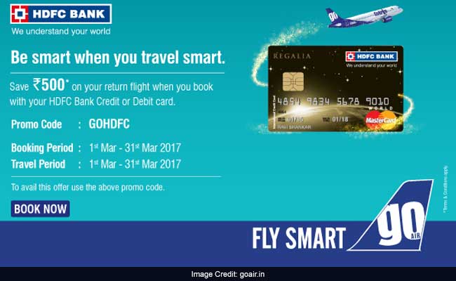As competition among airlines operating in the Indian market gains momentum, GoAir is offering a Rs 500 off on returns flights on bookings made using HDFC Bank cards under a limited-period scheme. GoAir's this scheme is applicable on tickets purchased using HDFC Bank credit and debit cards till March 31, 2017, the airline - which competes with the likes of Air India, IndiGo, Jet Airways, SpiceJet and Vistara - said on its website. "Use promo code GOHDFC, while you book your tickets with your HDFC Bank Credit or Debit Card and get Rs 500 off on your return flight. Hurry! Book now at www.goair.in," the GoAir website added.