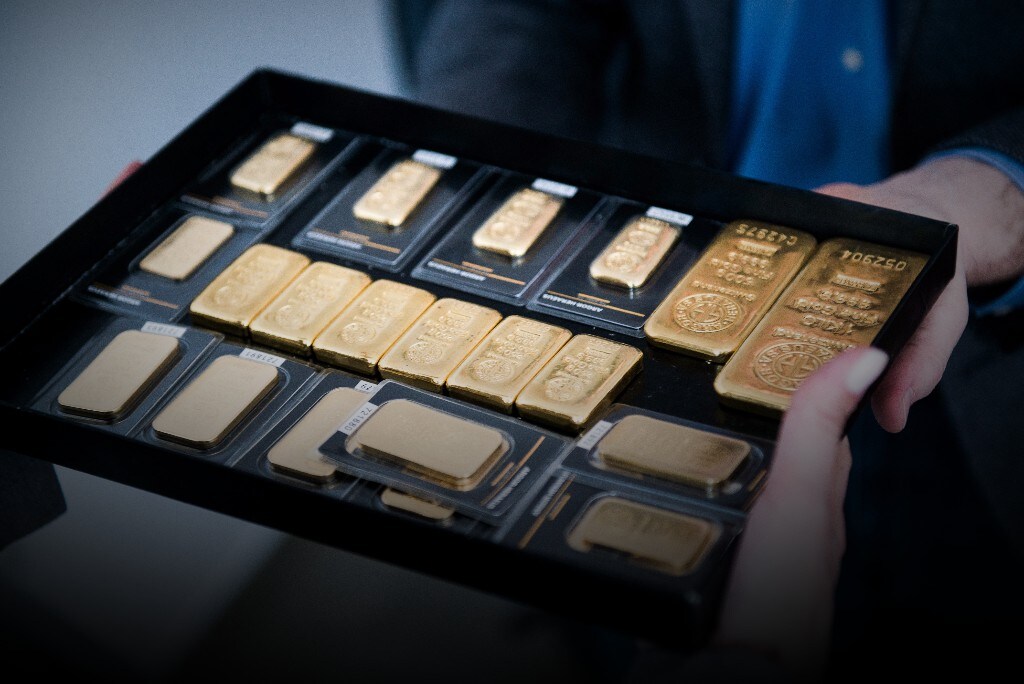 Employees carry mixed rate weighted gold bars in a storage tray in this arranged photograph (Photographer: Akos Stiller/Bloomberg)