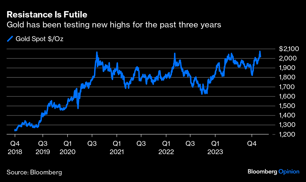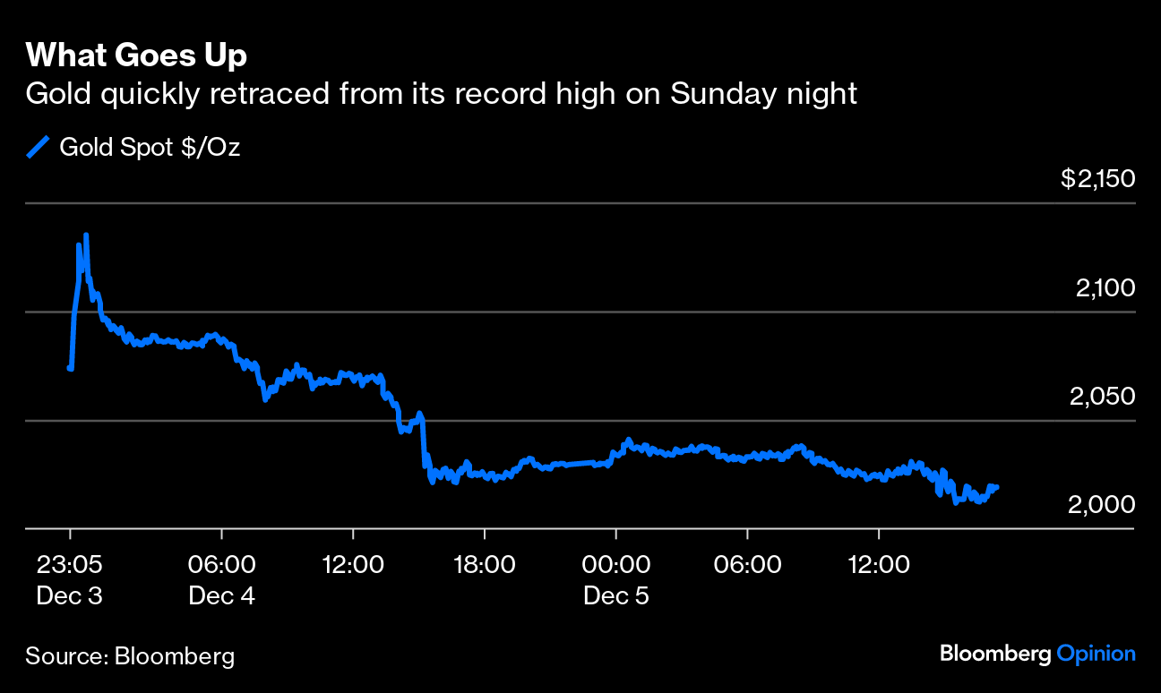 (Bloomberg Opinion) -- Blink and you missed it, but on Sunday night and into the early hours of Monday gold reached a record of more than $2,135 a troy ounce — and promptly fell back. Gold is now about 6% lower than that fleeting zenith and essentially unchanged from where it was a week ago. This isn't the behavior we expect of serious millennia-old asset classes; that's what magical new-age virtual tokens are for.