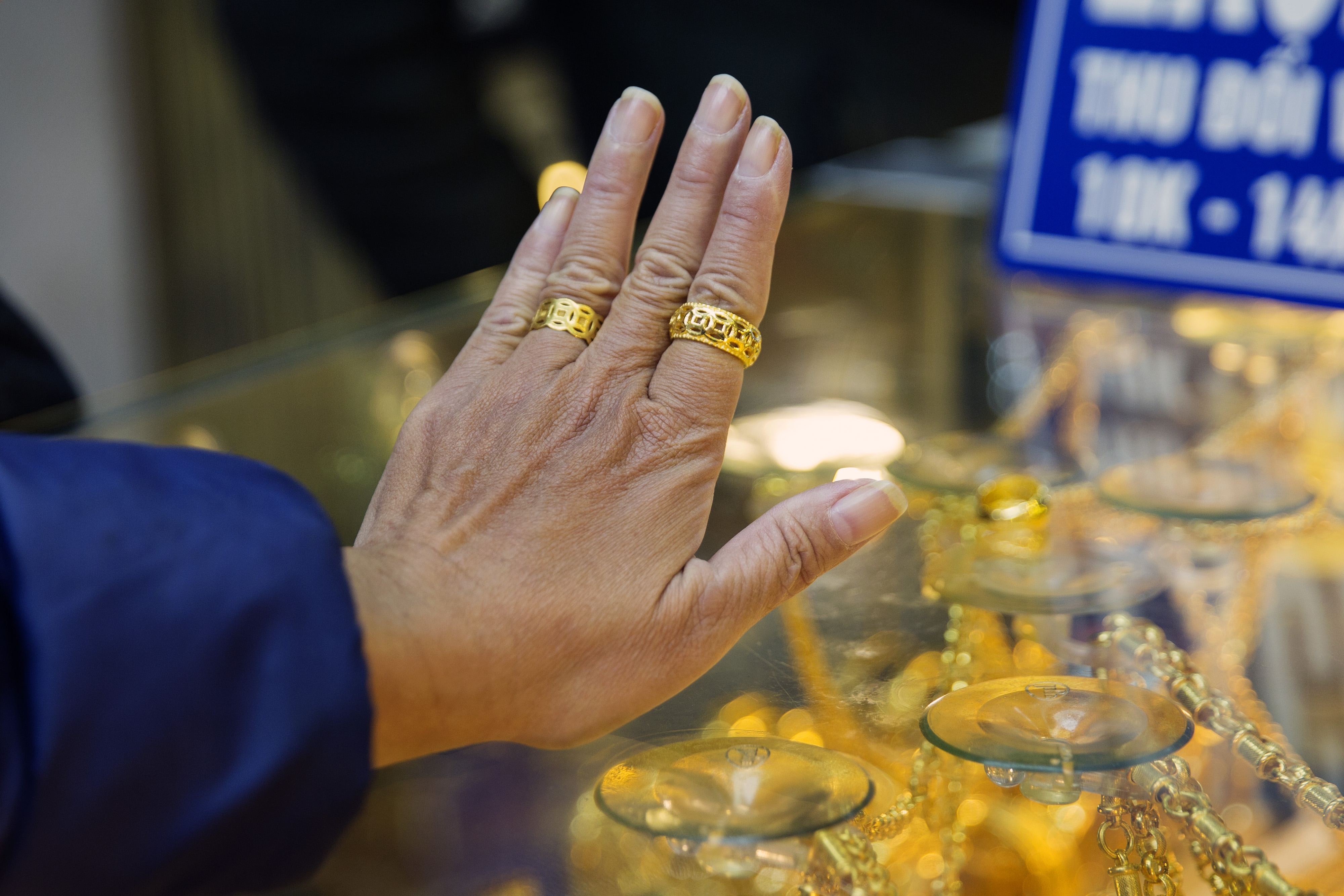 A customer tries on gold rings inside a jewelry store in Hanoi, Vietnam. (Photographer: Maika Elan/Bloomberg)