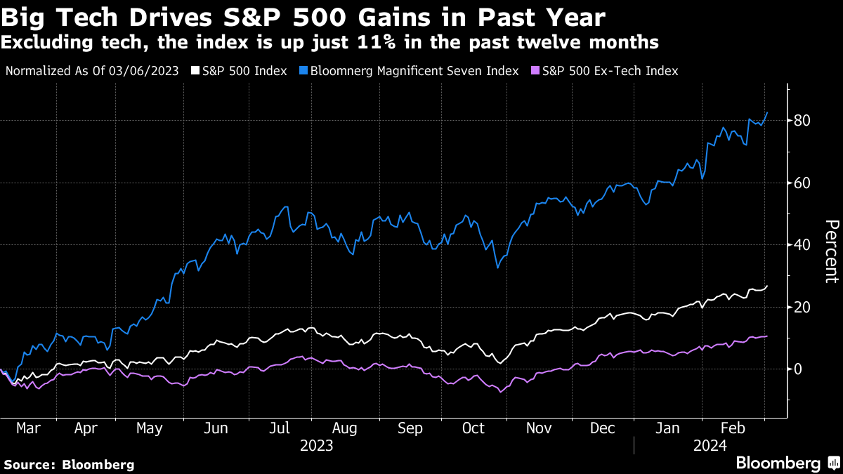 The so-called Magnificent Seven — comprising Apple Inc., Microsoft Corp., Nvidia Inc., Amazon.com Inc., Meta Platforms Inc., Alphabet Inc. and Tesla Inc. — have powered the S&P 500 to all-time peaks this year, partly fueled by the frenzy around artificial intelligence. The gains have left strategists scrambling to lift their end-2024 targets for the benchmark index just two months into the year.