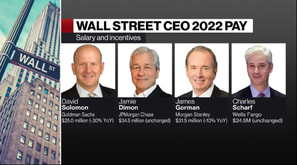 Solomon, 61, was one of the best-paid CEOs at a major US bank for 2021, receiving $35 million in compensation — a figure matched by Morgan Stanley's James Gorman for that year. For 2022, Gorman saw his pay cut by 10% to $31.5 million. JPMorgan Chase & Co. left CEO Jamie Dimon's pay unchanged at $34.5 million for that year.