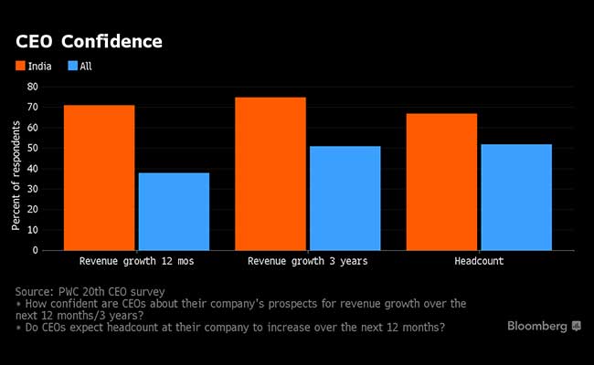 While global chief executives are less interested in India than they were in 2011 -- "perhaps because structural reforms have been slow to come" -- local business leaders are more optimistic about prospects in the South Asian nation. PWC surveyed almost 1,400 CEOs across 79 countries.