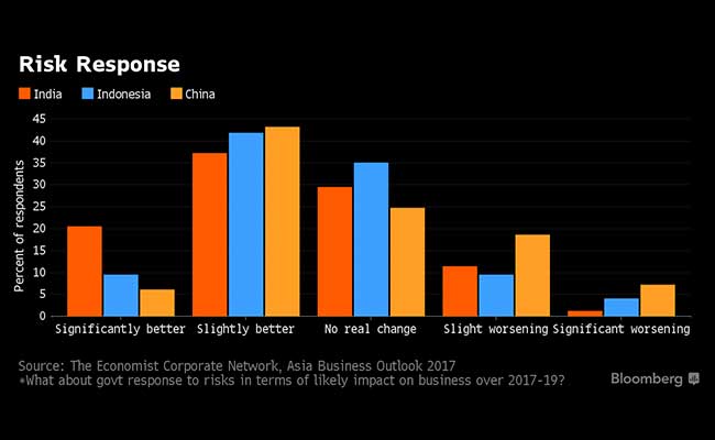 Credit must also be given to policy makers, whose responses to political and economic risk are seen as most likely to help business prospects. About 20 percent of respondents in the Economist's survey felt their firm's expectations were "overly optimistic" for China. The same proportion believed that corporate expectations were too low for India.