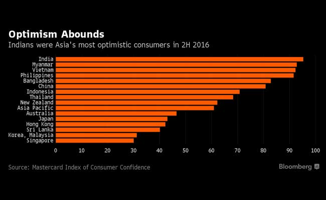 Much of this confidence can be attributed to consumption, crimped by PM Modi's cash ban but still the highest in Asia. Consumer sentiments, which slipped 2.4 points in June-December from the first half of 2016, stays in "extremely optimistic" territory in Mastercard's survey.