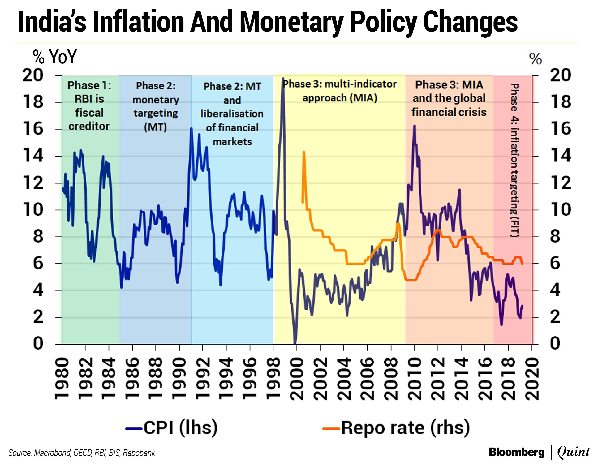 In the 1980s, the economy was plagued by volatile and high inflation, which was the result of monetary policy being completely subservient to fiscal policy. In the following decades, India was sent to the Alchoholics Anonymous and several reforms were implemented to phase out the fiscal dominance of monetary policy.