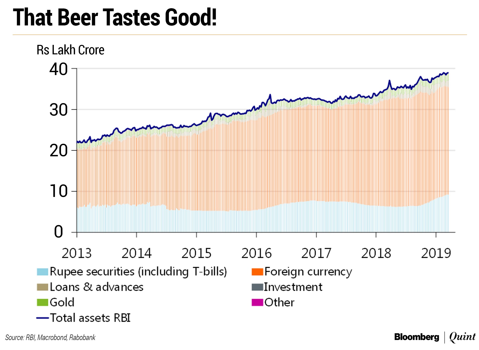 In fiscal 2018-19, the RBI has been very active on the bond market, pumping more than Rs 2.8 lakh crore into the system by buying government bonds. This is as much as 70 percent of the total net government bond issuance over FY19. The intervention is clearly visible on the balance sheet of the RBI: see the light-blue bars in the table below.