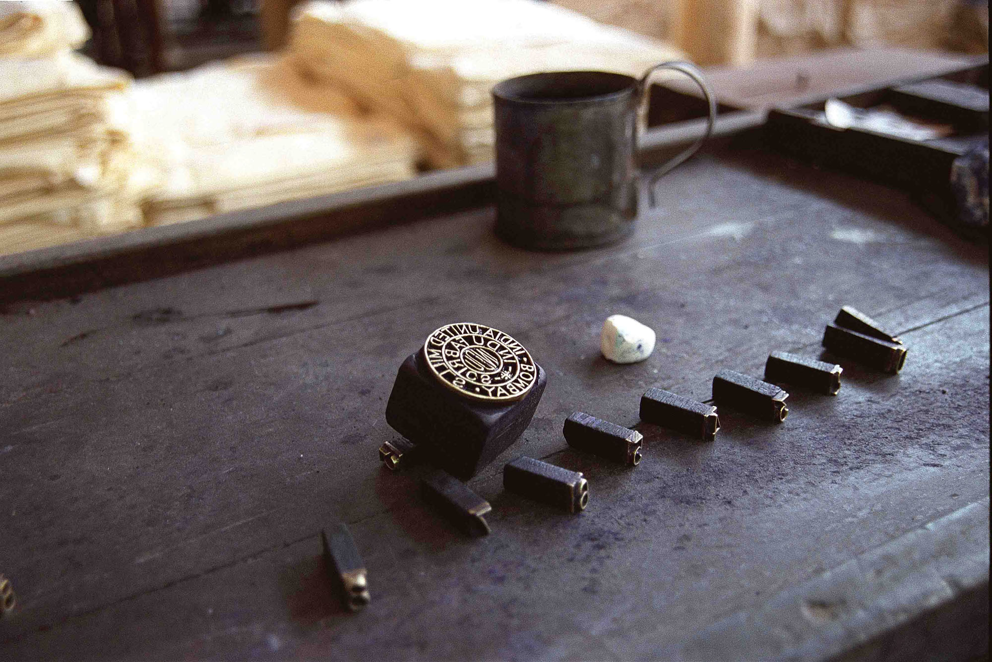 Carved brass stamps, used to mark textiles with the company’s name, sit on a table at a mill in Mumbai. (Photographer: Santosh Verma/Bloomberg News)