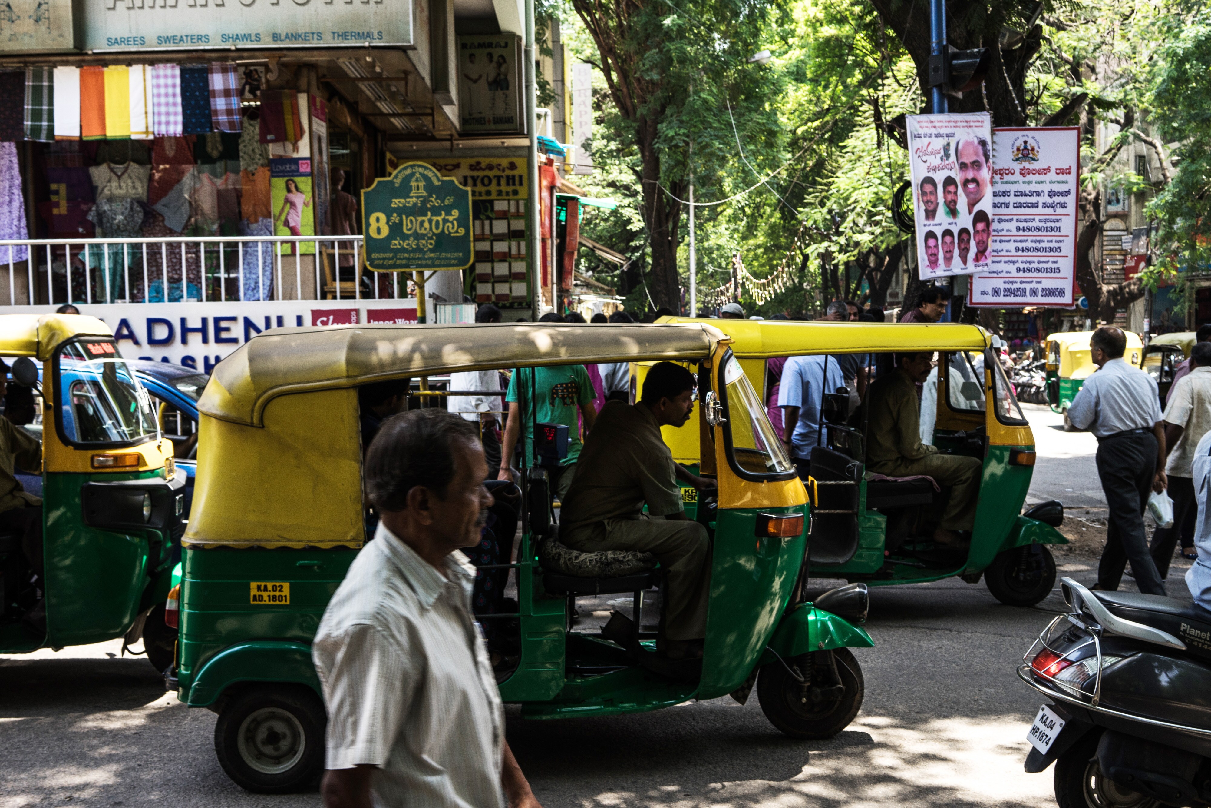 Pedestrians walk past auto rickshaw sitting at a traffic light in the Malleswaram district of Bangalore (Photograph: Sanjit Das/Bloomberg)
