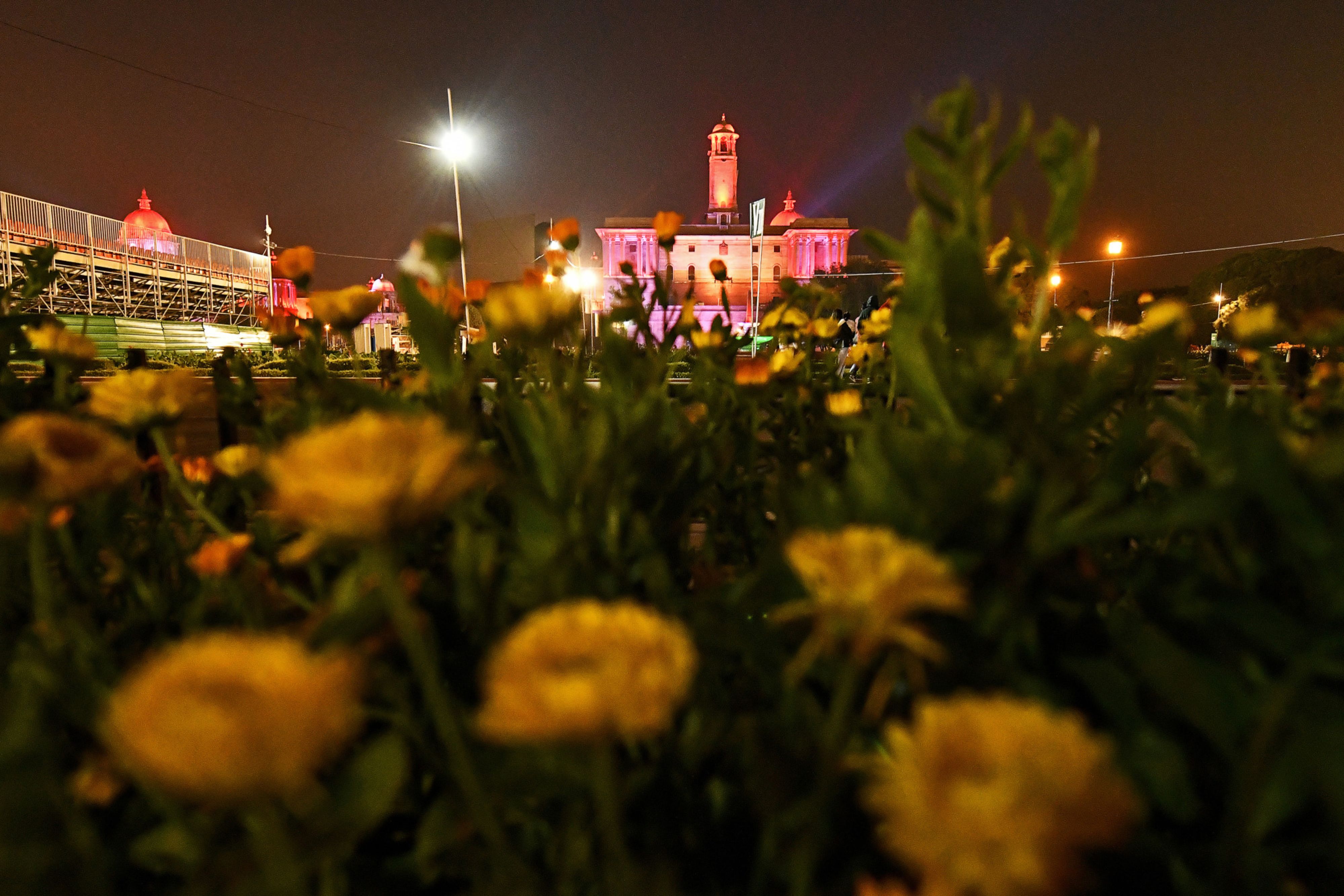 The North Block of the Central Secretariat buildings, which houses the Ministries of Finance and Home Affairs, stands illuminated at night in New Delhi, India. (Photographer: Anindito Mukherjee/Bloomberg)