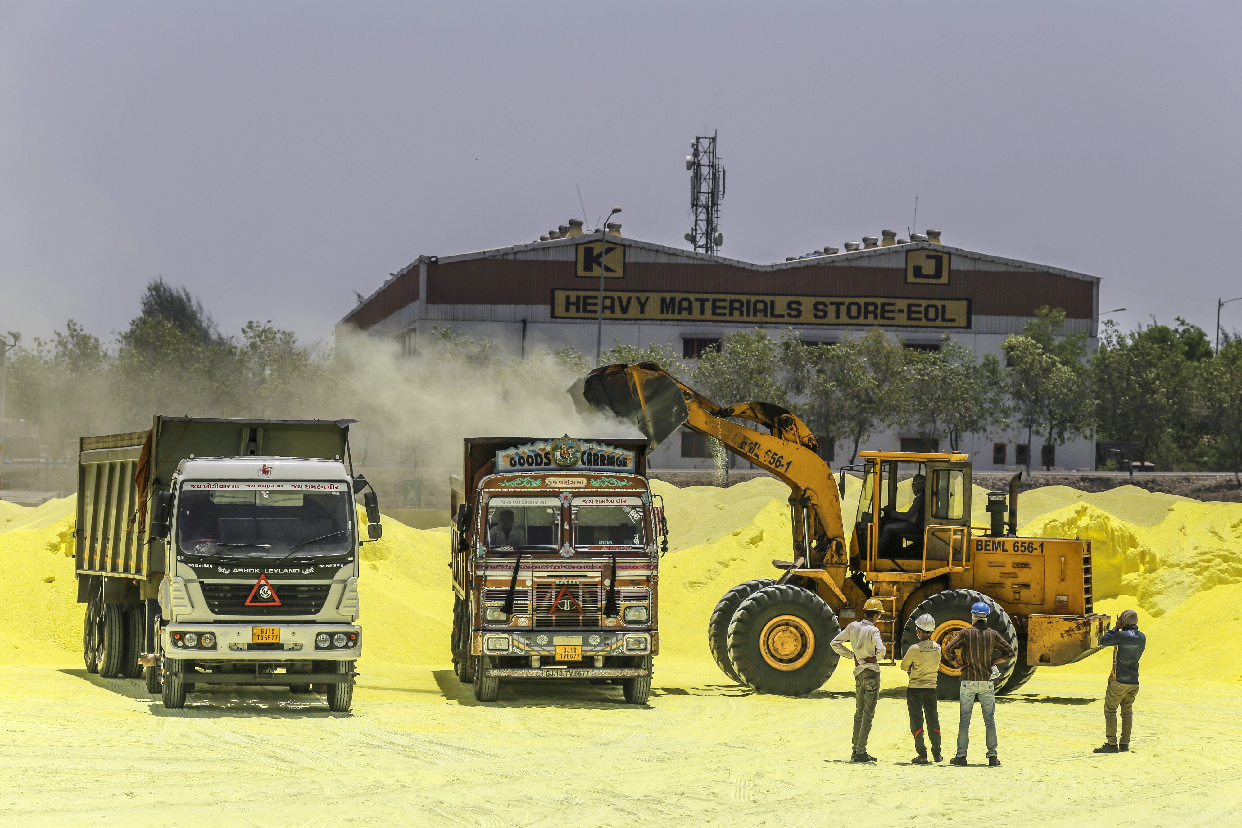 An excavator loads sulfur into trucks near Vadinar, Gujarat. (Photographer: Dhiraj Singh/Bloomberg)