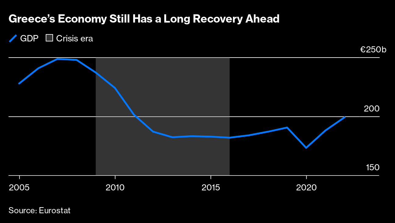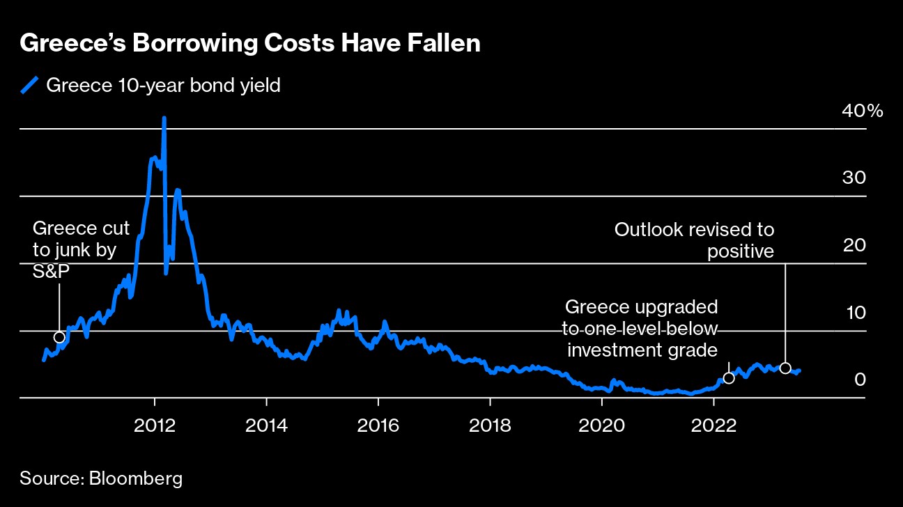 Now 10-year government bond yields, which spiked above 40% in 2012, are below 4%. (Bond yields fall when prices rise.) That's a bit less than the return investors demand on Italian bonds and only about 1.4 percentage points more than supersafe German debt. Greece could even gain investment-grade status again. In an interview with Bloomberg Television, newly reelected Prime Minister Kyriakos Mitsotakis said he aims to secure the upgrade from major rating companies this year. “It changes lots of things,” he said. “There's currently a lot of capital that cannot invest in Greece simply because we are not investment-grade.”