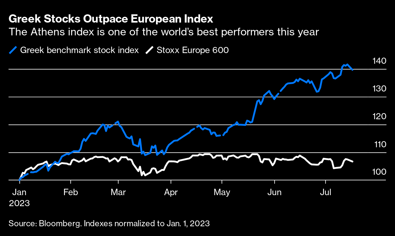 Flows of outside money into stocks and bonds have jumped about 14% this year, propelling the Athens equity market into the top three performers in the world with a gain of more than 40%. Greece is the euro area's best-performing bond market, with borrowing costs falling more than half a percentage point in 2023.