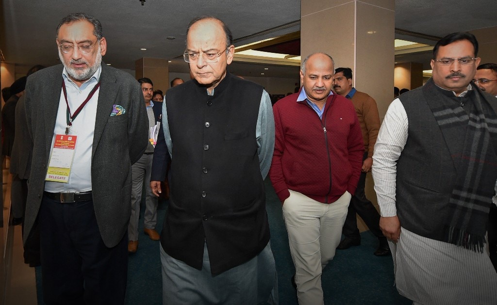 Union Finance Minister Arun Jaitley and Delhi Deputy Chief Minister Manish Sisodia during a GST meeting at Vigyan Bhavan, in New Delhi (Source: PTI)