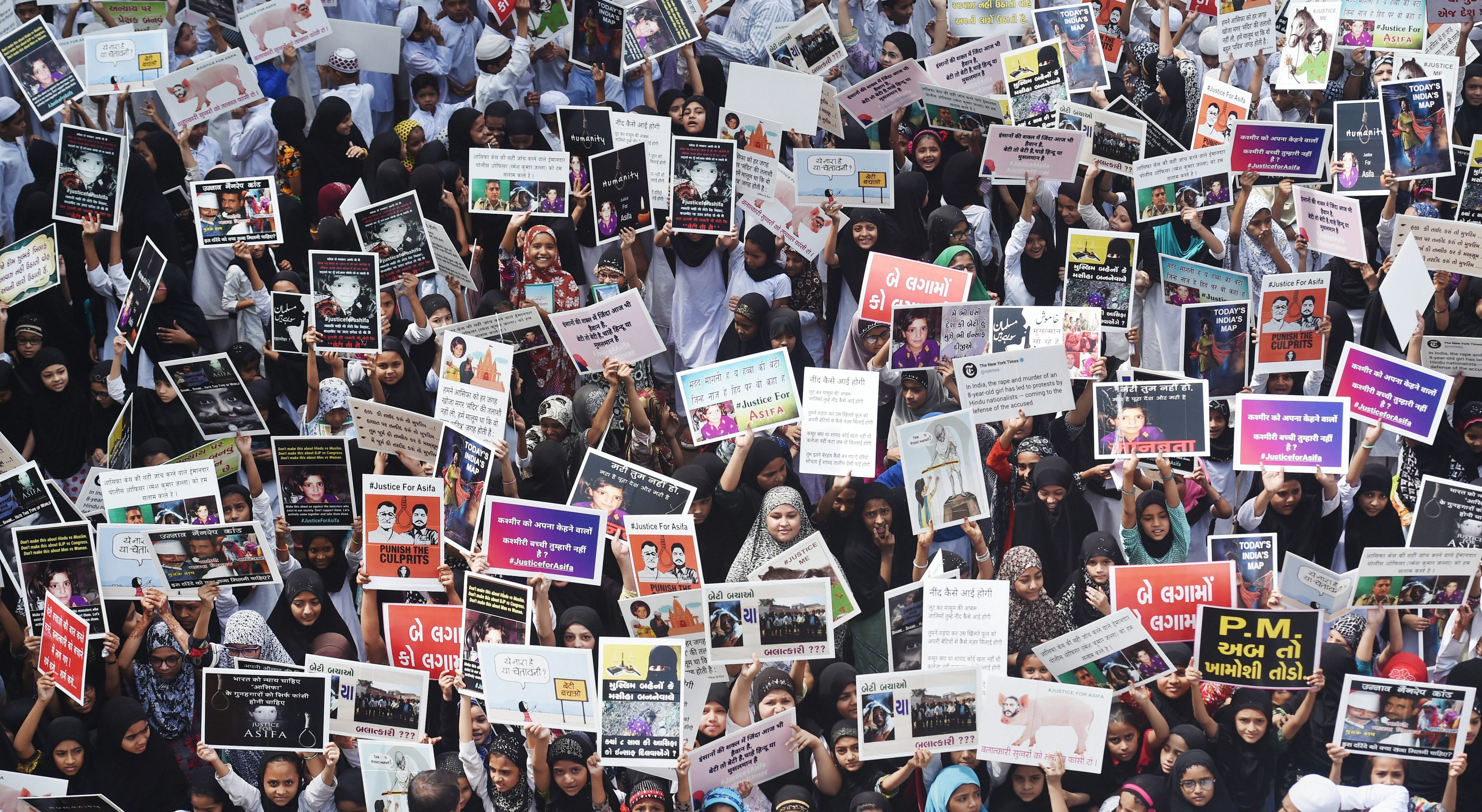 Students display placards as they protest over government’s alleged ‘inaction’ in Kathua and Unnao rape cases, in Ahmedabad on April 15, 2018. (Photograph: Santosh Hirlekar/PTI)