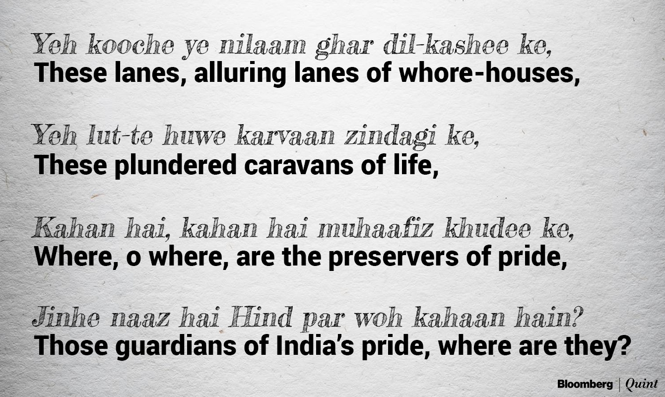 Independent India was only ten years old when Pyaasa came as a picture of ideological anguish. The glow of freedom had gotten dimmed by cynicism over rising social divisions, inequalities of wealth, feudal assertions, and political schisms with Pandit Jawaharlal Nehru's government. Guru Dutt marshalled the genius of Sahir Ludhianvi (lyrics), SD Burman (music) and Mohammad Rafi (vocals) to create this epic poem of revolt: