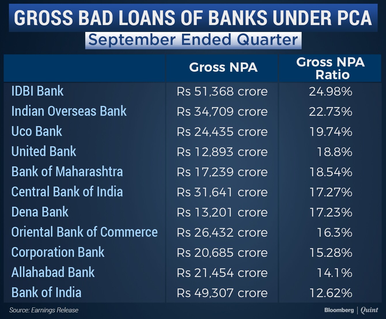Since April, 11 banks have been put under the corrective action framework. The latest is Allahabad Bank which informed exchanges on Wednesday that it was now subject to the RBI's corrective action. Other banks under the corrective framework include Bank of India, Central Bank of India, IDBI Bank, UCO Bank, Dena Bank, Oriental Bank of Commerce, Indian Overseas Bank, Bank of Maharashtra and Corporation Bank. United Bank of India, which was among the first lenders to be put under corrective action in 2014, is also back on the watch list.