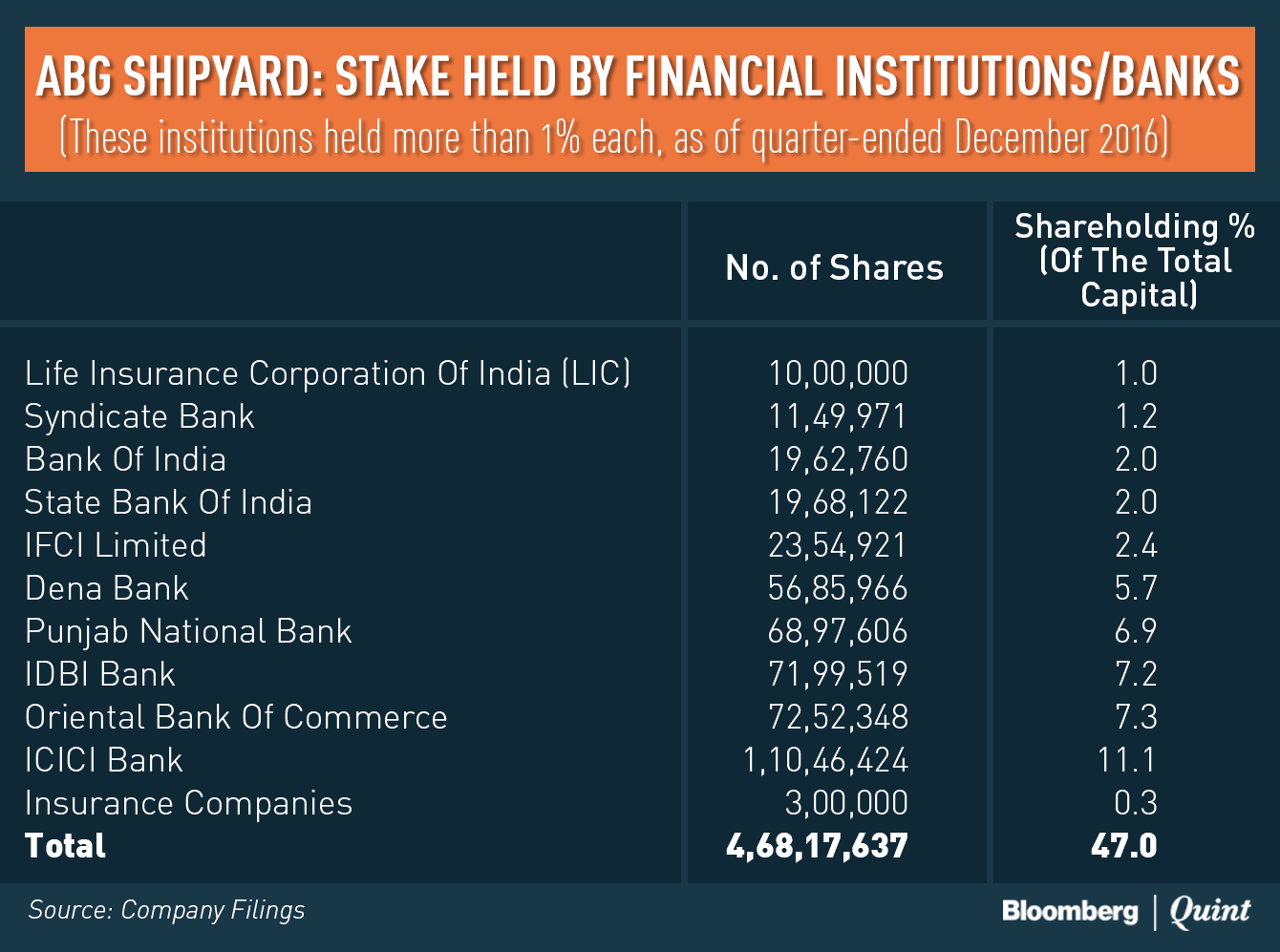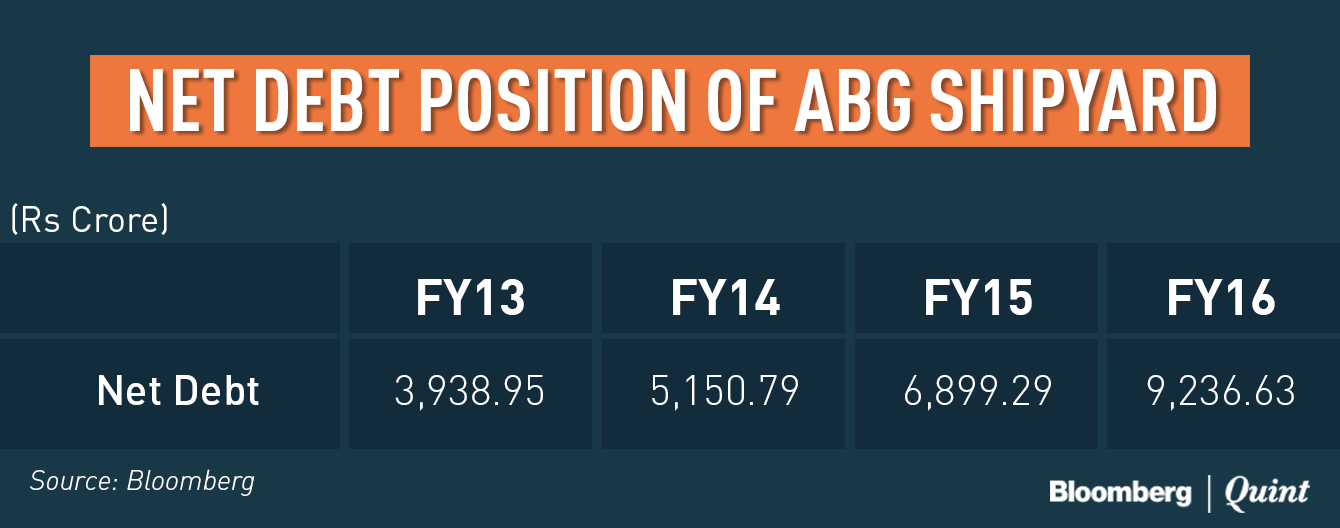 ABG Shipyard has been under corporate debt restructuring since March 2014, when a group of lenders, including State Bank of India, Bank of Baroda, Punjab National Bank, Central Bank, Dena Bank, Yes Bank and ICICI Bank, agreed to recast the company's loans.